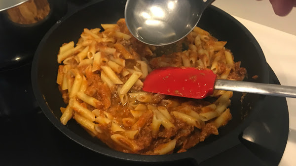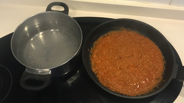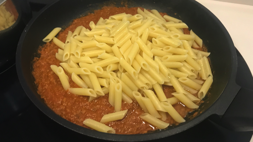 Introduce la pasta y cuécela según las indicaciones del fabricante. Quizás un par de minutos menos para que termine de hacerse en la salsa boloñesa.