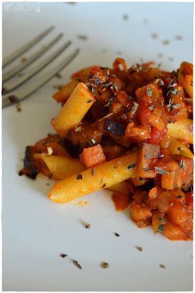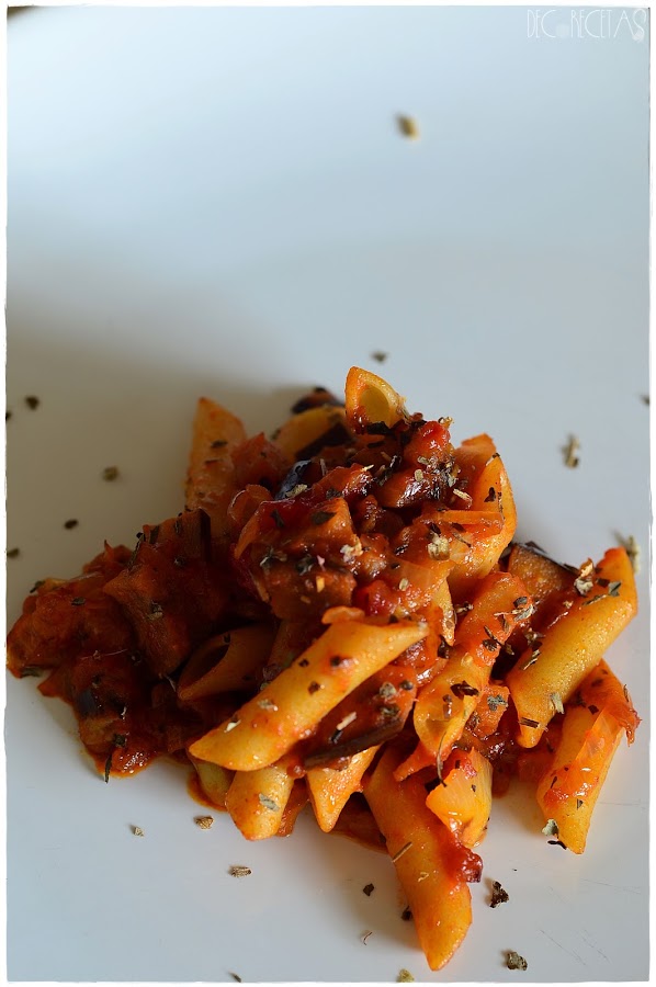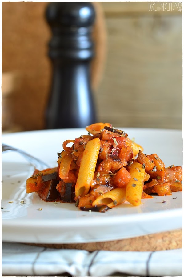 Cocemos los macarrones en agua hirviendo los minutos que nos indique el fabricante. Hacemos la salsa, pochando media cebolla a la que añadimos media berenjena cortada en cubitos. Agregamos 200ml de salsa de tomate triturado, sal y pimienta al gusto, y mezclamos con la pasta espolvoreando hiervas provenzales por encima.