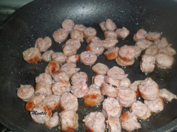 Mientras en una sartén pondremos 2-3 cucharadas de aceite y pondremos las salchichas troceadas.