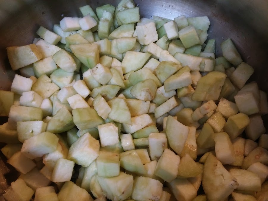 Pelamos las berenjenas y las cortamos a dados.