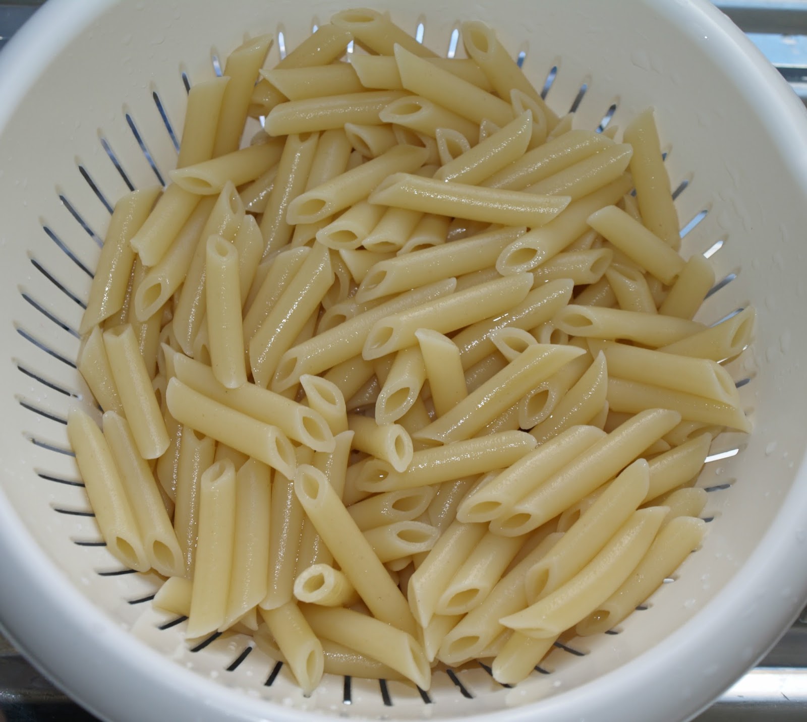 - En una cacerola ponemos a calentar agua con un poco de sal y un chorrito de aceite. Cuando empiece a hervir añadimos los macarrones y cocemos unos 8-10 minutos o según las instrucciones del paquete. Pasado el tiempo, cunado estén "al dente" los colamos y los pasamos por agua fría para que no se apelmacen.