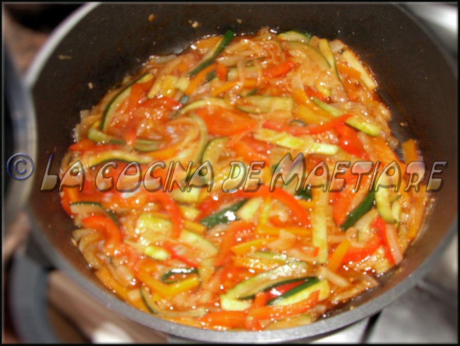 Añadimos el pimiento y seguimos cocinando un par de minutos más. Añadir el calabacín y una pizca de orégano. Seguir salteando el conjunto.