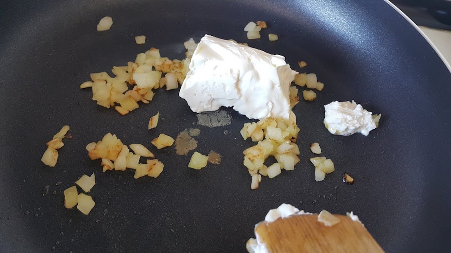 Cuando tengamos la cebolla doradita añadimos las 2 cucharas de queso crema y las vamos deshaciendo a fuego bajo. Por cada ración habría que añadir 2 cucharadas de queso.