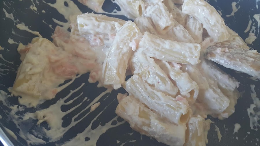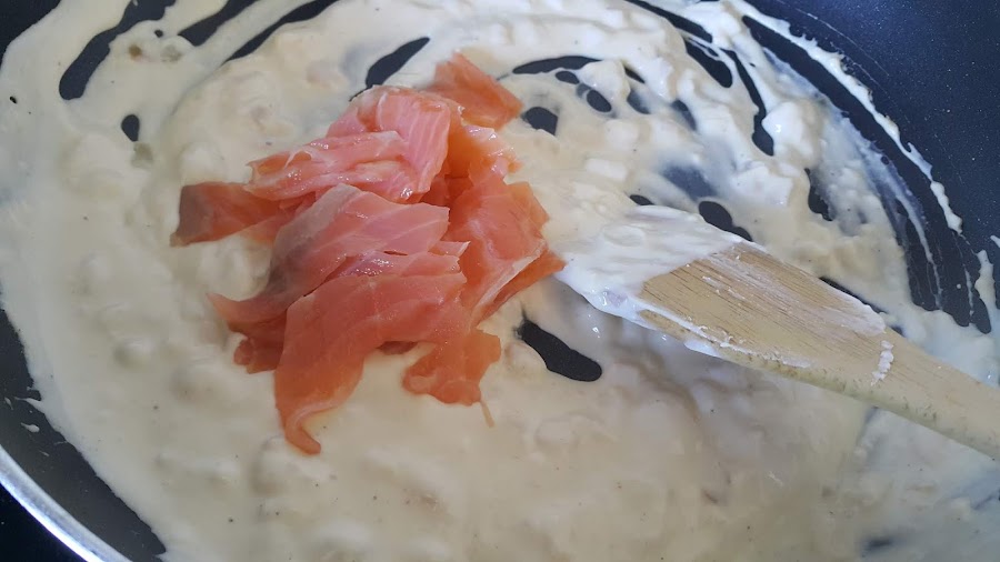 Vertemos el vaso de leche y lo integramos al queso. Seguidamente apagamos el fuego y añadimos el salmón cortado a trocitos a la sartén y mezclamos.
