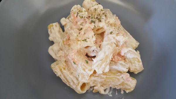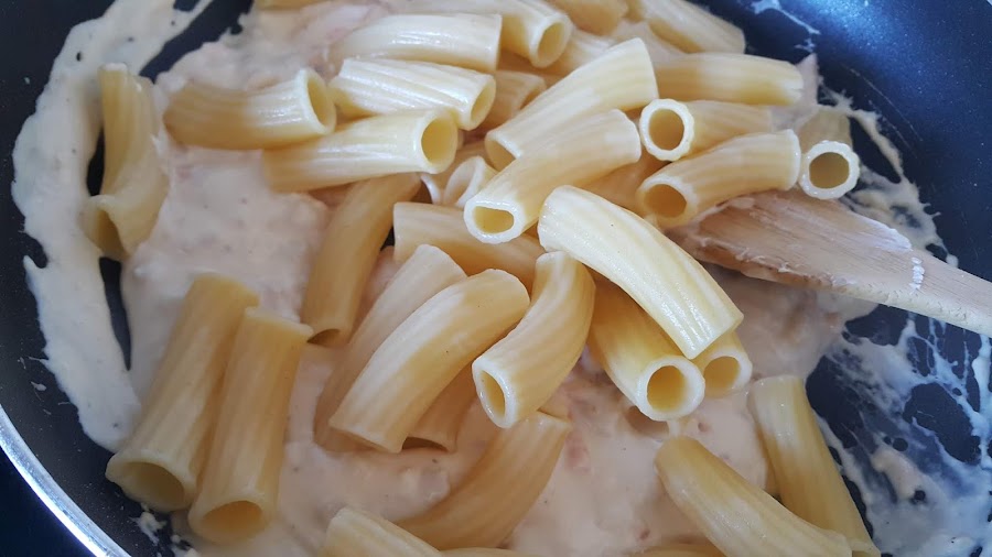 Mezclamos bien la pasta con el aderezo y molemos un poco de pimienta por encima.