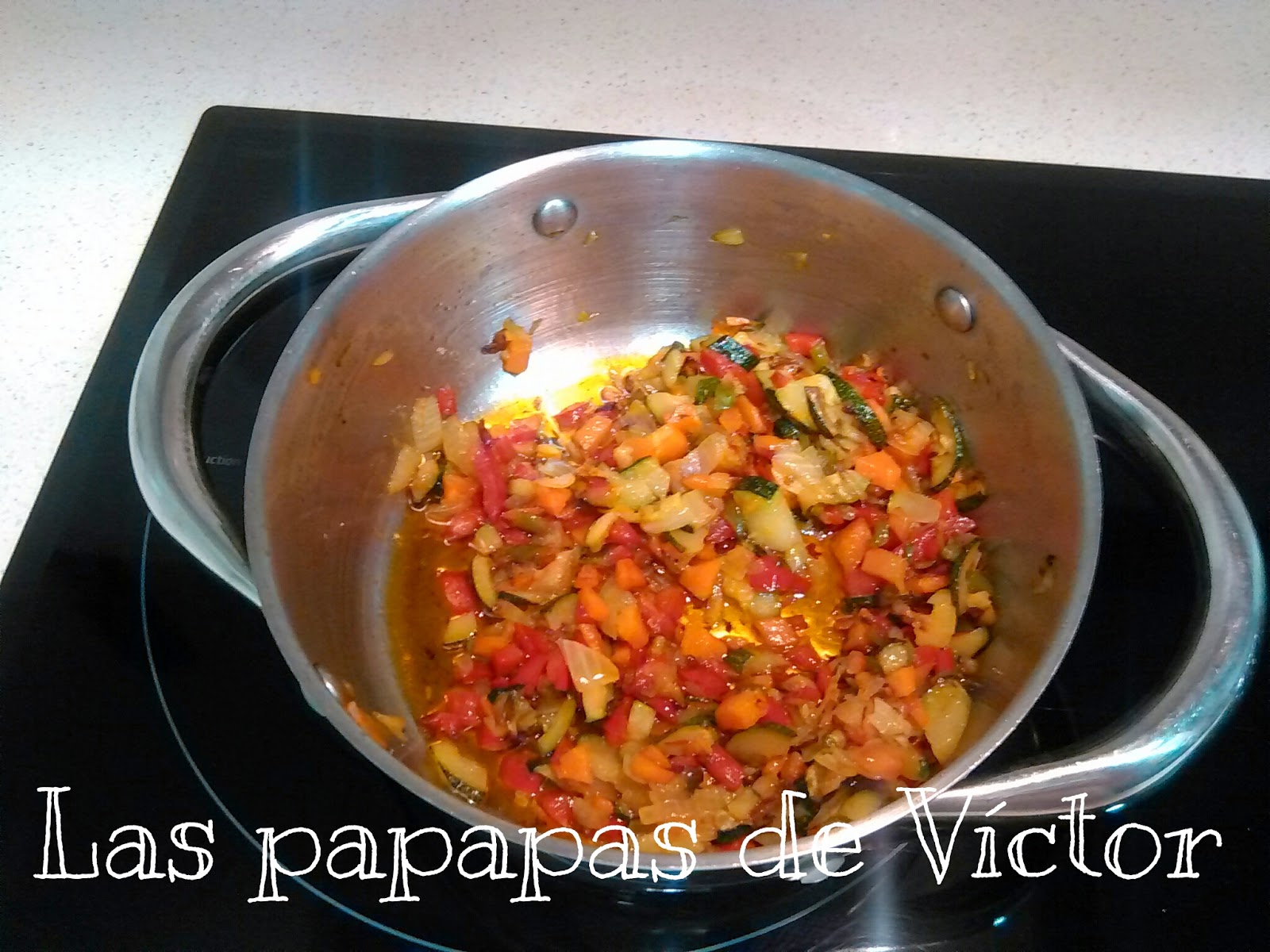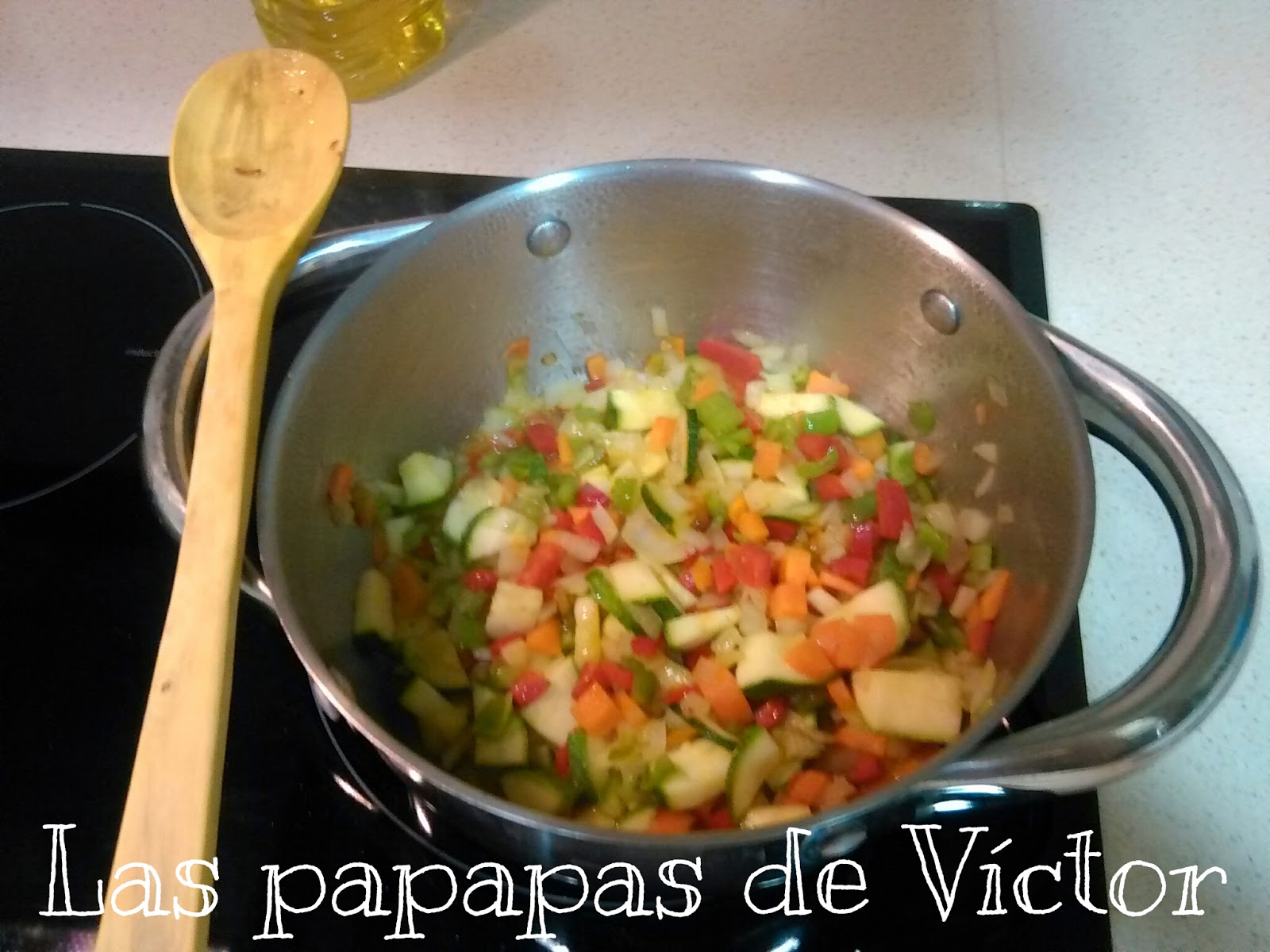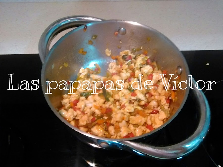 Poner a pochar todas las verduras y a la que casi estén pochadas del todo, añadir el pollo cortadito