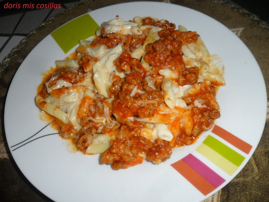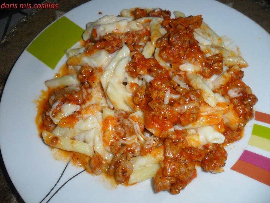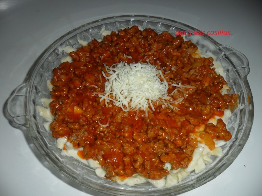 Servimos en una fuente apta para el horno los macarrones cubiertos con la salsa bechamel caliente, encima la salsa boloñesa y cubrimos con queso parmesano.