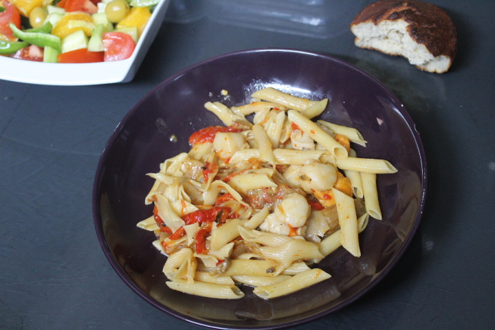Sofreímoslas zamburiñas unos 5 minutos, añadimos la samfaina, el vino y los macarrones.