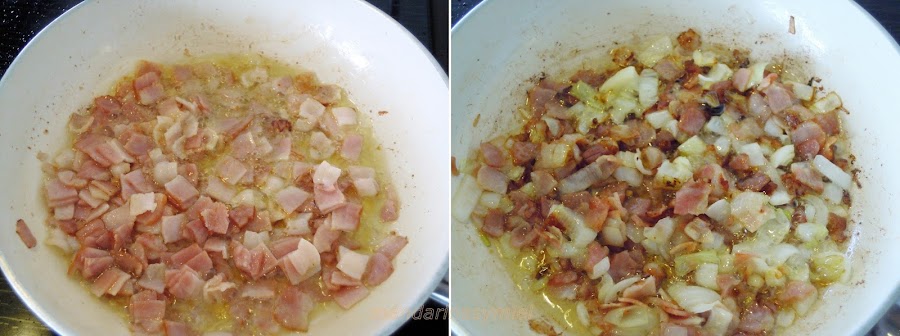 Fríe el bacon en una sartén con la cebolla tierna cortada a rodajas, reserva.