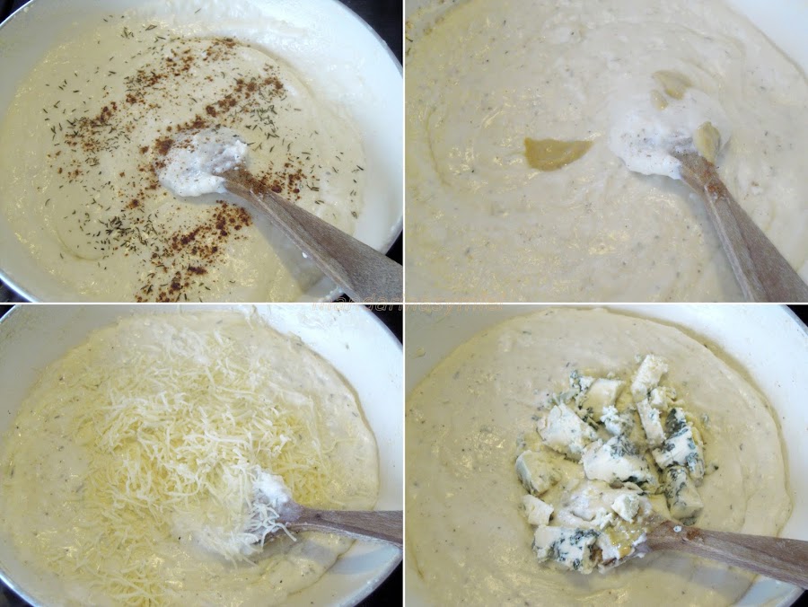 Añade la mitad del queso rallado y del queso azul, mezcla hasta que se deshaga todo el queso.