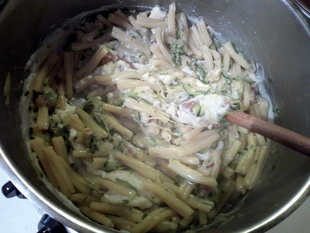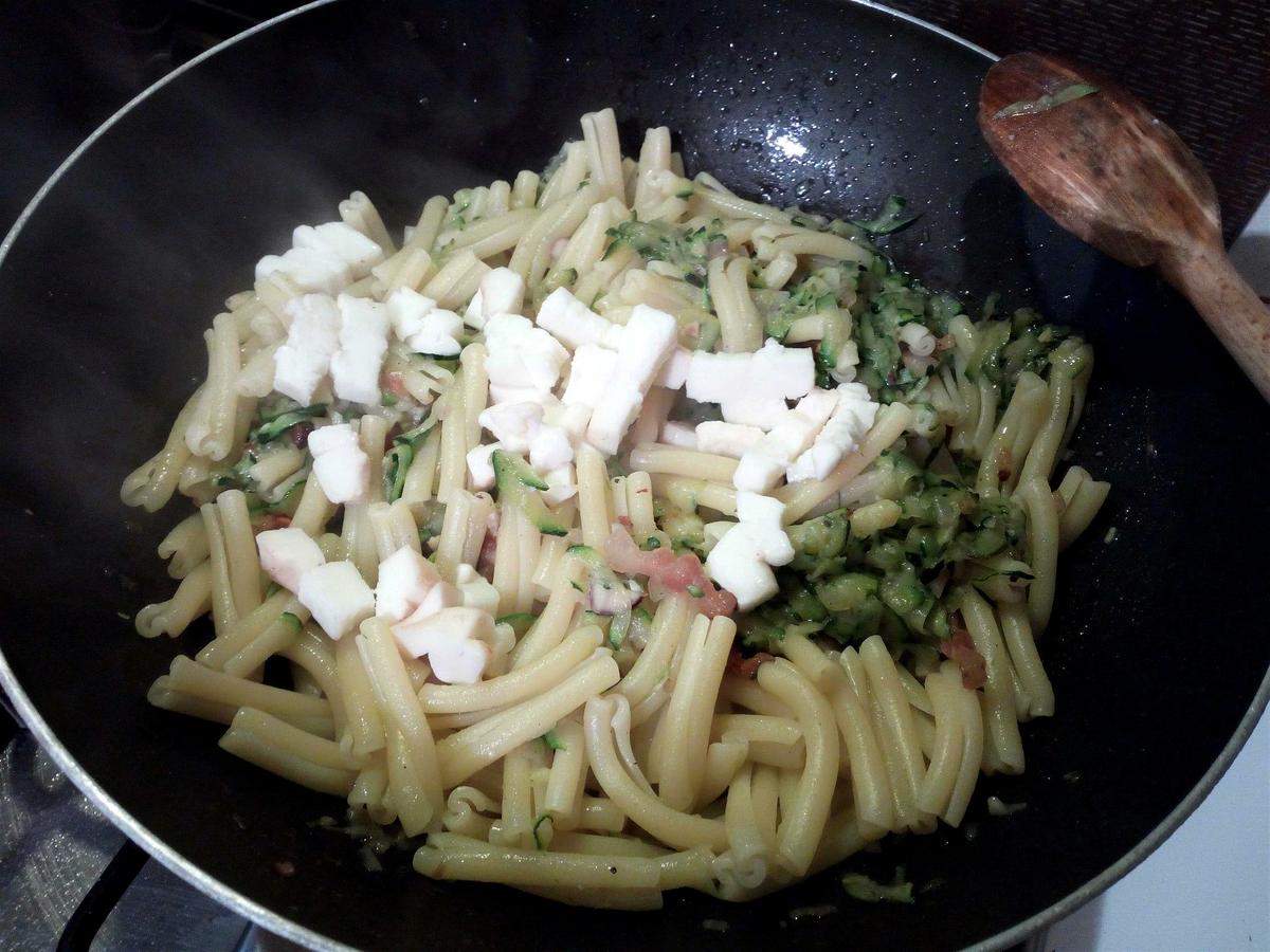 Mezclar para que todo coja sabor. Escurrir la pasta, al dente, no hace falta sacarla antes del tiempo. Volcar en la sartén y añadir el queso provola ahumada.
