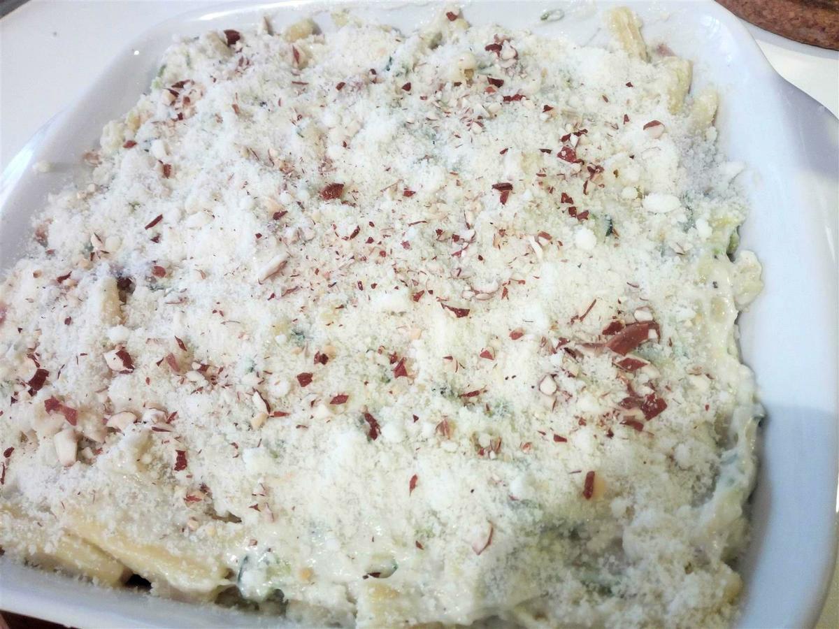 Transferir en una bandeja de horno. Completar con queso pecorino o parmesano rallado y el resto de almendras.