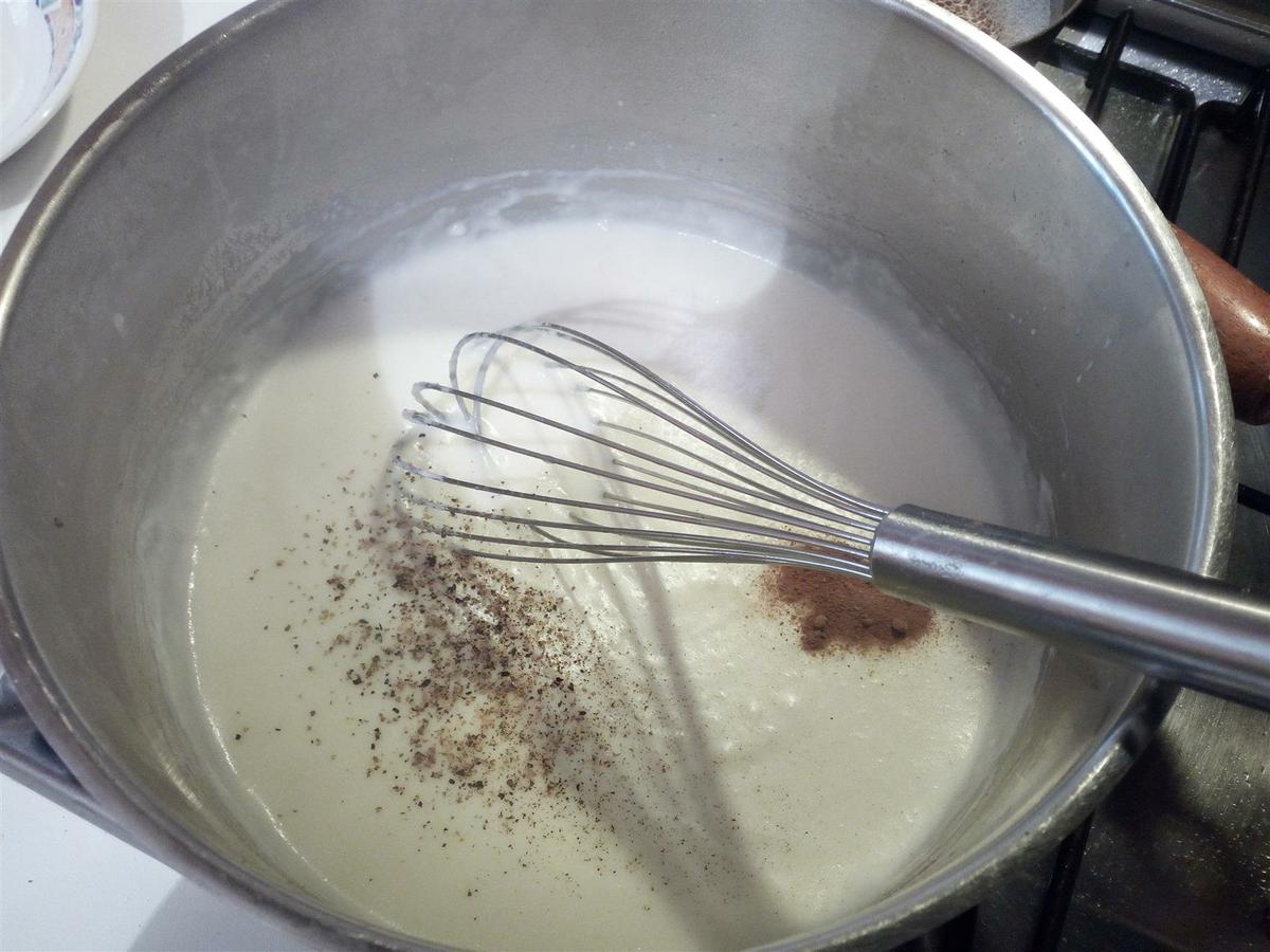 Mientras que se prepara este paso, la leche hierve, por lo tanto, incorporar al roux. Mezclar rápidamente, siempre a fuego suave, y en cuestión de minutos, la bechamel está lista. Agregar una pizca de sal, pimienta y nuez moscada y mezclar nuevamente. Conservar.