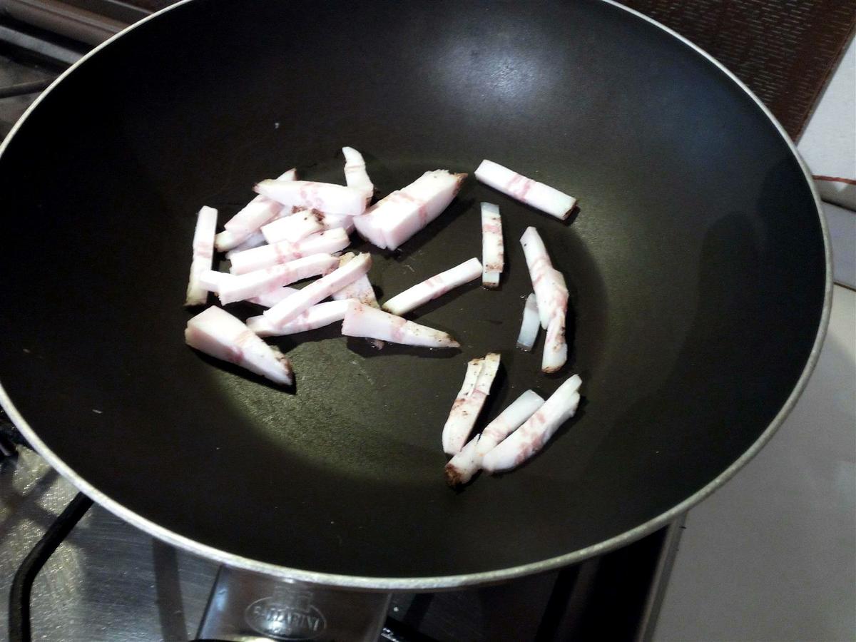 El siguiente paso es poner el agua a hervir, y durante el tiempo que hierva y cuece la pasta, preparar el condimento: en una sartén, poner la panceta o bacon, empezando desde la sartén fría, así que calentando, la panceta suelte las grasas.