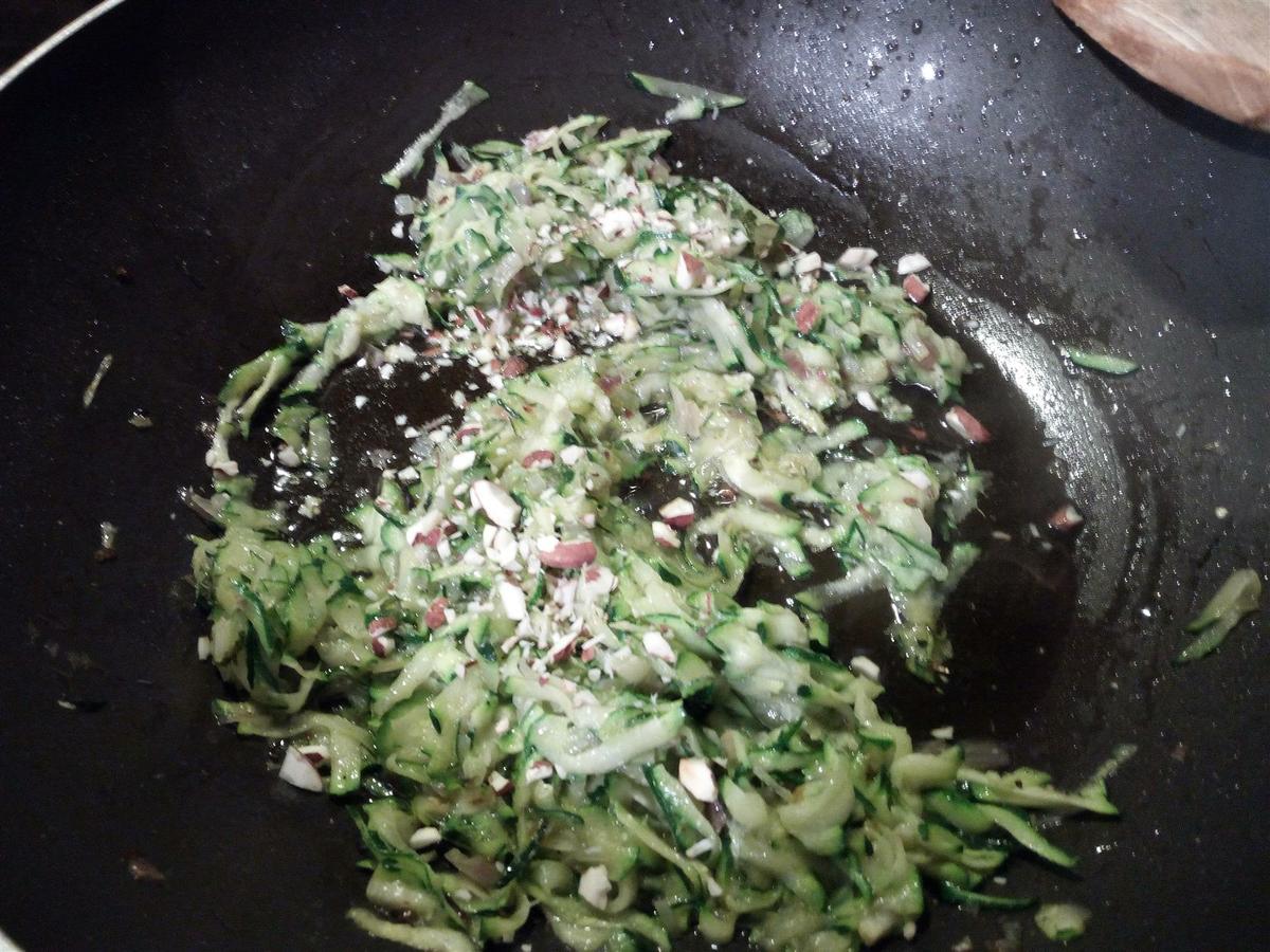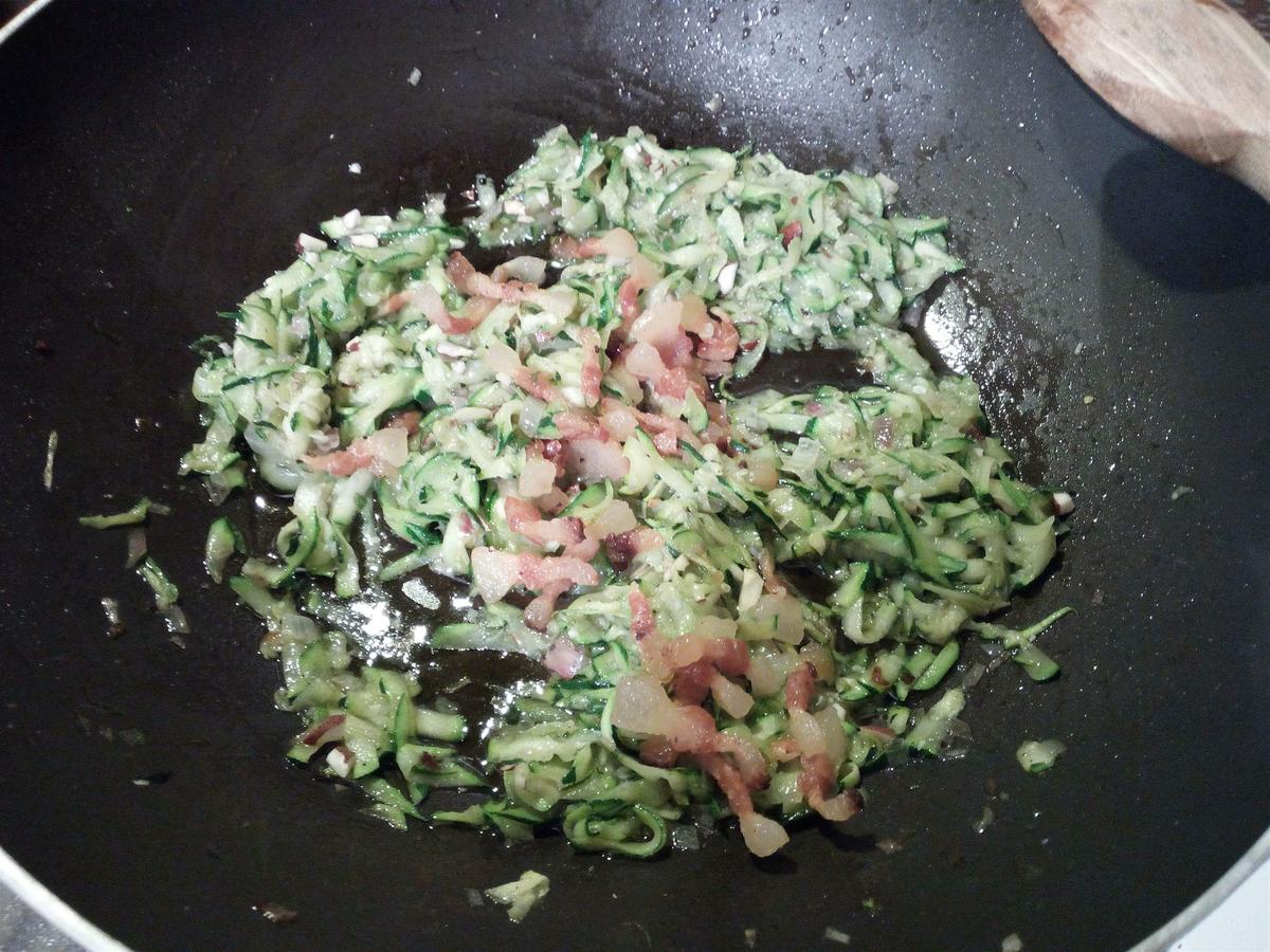 En la misma sartén, añadir un poco de aceite (poco, porqué ya hay la grasa de la panceta) y sofreír el chalote picado. Incorporar el calabacín rallado.