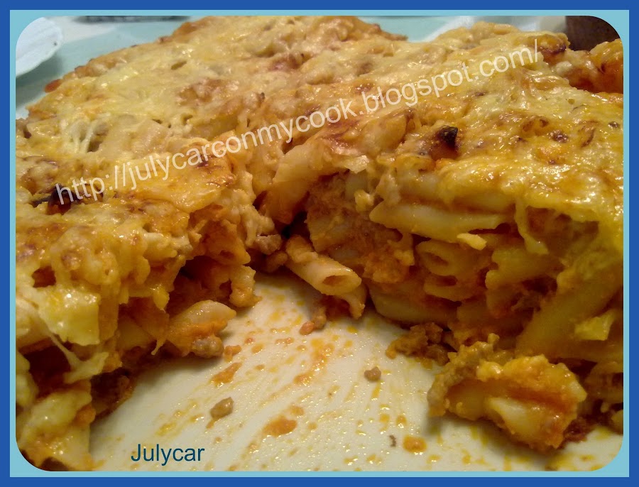 Poner aceite de oliva en la cubeta de la Cocimix DeLuxe (cubrir el culo de la cubeta) programar menú arroz 8 minutos, presión II, cuando este caliente añadir la cebolla y el ajo dorar un poco cuando este dorado añadir la carne y dorar un poco, añadir el tomate y los macarrones, remover bien y cubrir los macarrones con agua (solo cubrir que se vean un pelin), tapar con válvula cerrada y dejar terminar el programa, cuando termine despresurizar manualmente, remover y batir los huevos y añadirselo a los macarrones, añadir la leche y la mitad de la bolsa de queso remover bien echar por encima la otra mitad del queso y tapar con la tapa doradora, ahora programar la Cocimix DeLuxe menú horno, 120º, 10 minutos, la tapa doradora 250º, 10 minutos, cuando termine sacar y servir
