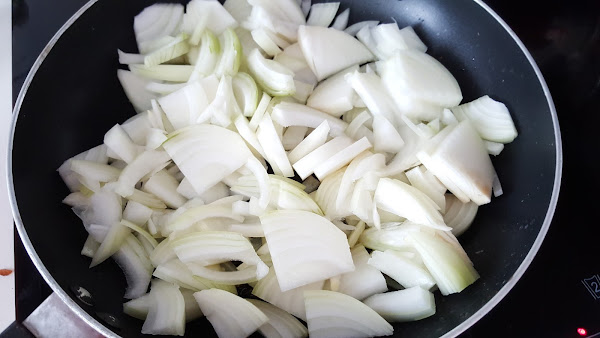2. - Mientras, troceamos la cebolla y la ponemos en una sartén con un poco de aceite, a fuego medio.