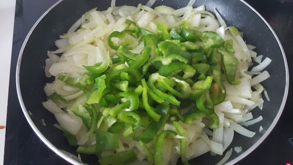 3. - Troceamos el resto de ingredientes y añadimos, primero los pimientos.