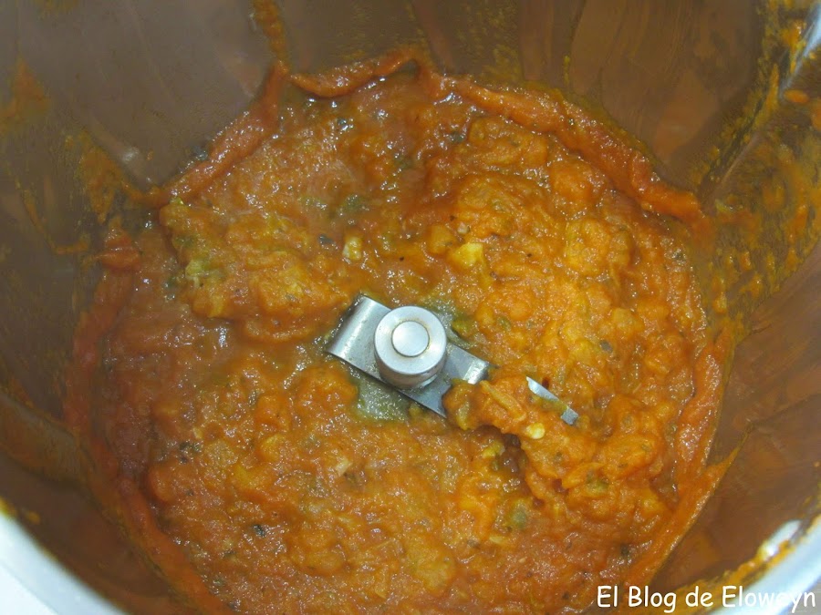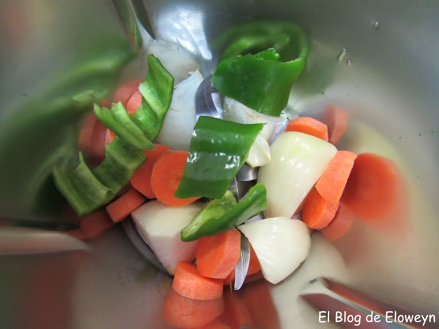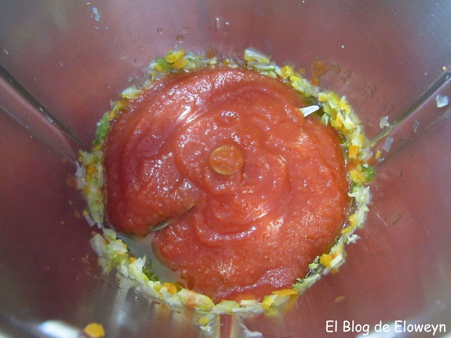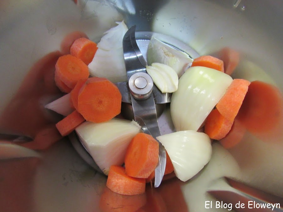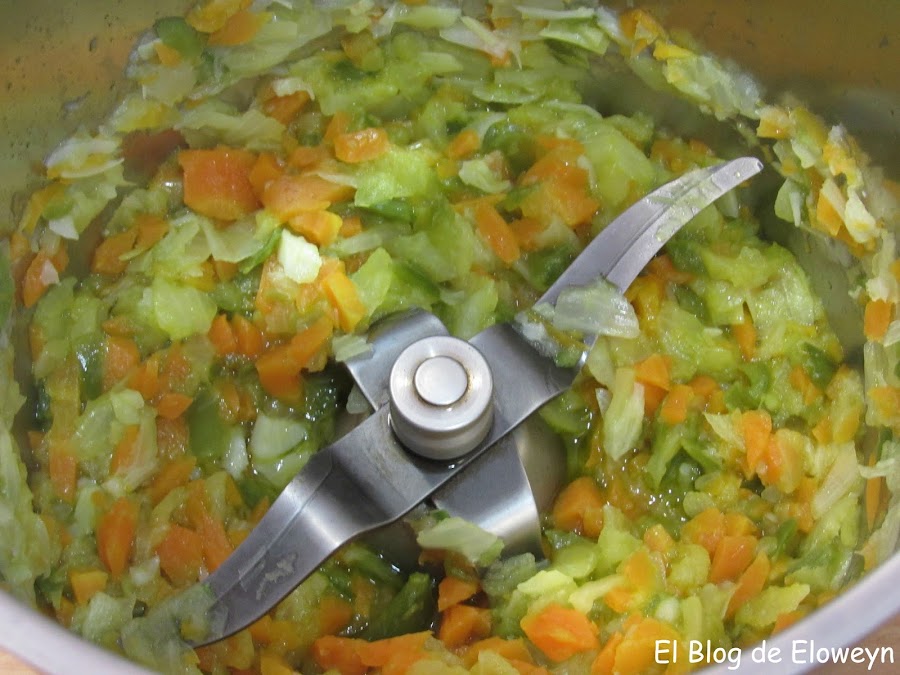 Triturar durante 2 segundos a velocidad 5. Bajamos la comida que se haya quedado en las paredes con una espátula.