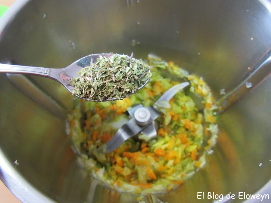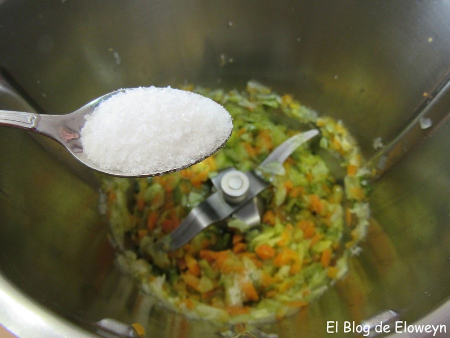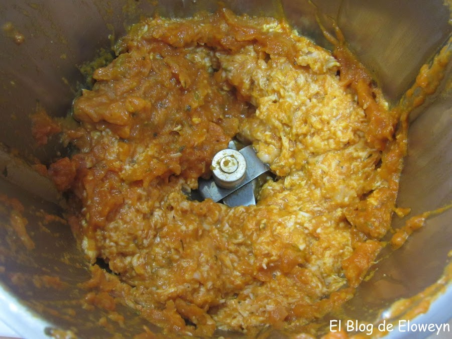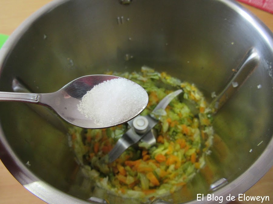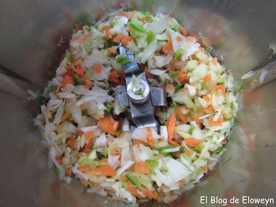 Triturar durante 2 segundos a velocidad 5. Bajamos la comida que se haya quedado en las paredes con una espátula.