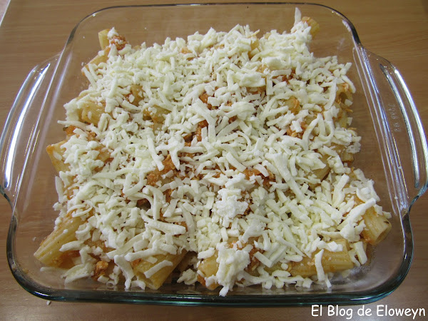 Cocemos los macarrones el tiempo que indique el paquete. Una vez que haya pasado el tiempo indicado, los escurrimos con un colador. Untamos con un poco de aceite en una fuente apta para horno, Ponemos en la fuente los macarrones y la mezcla de pollo que habíamos preparado. Lo removemos todo.