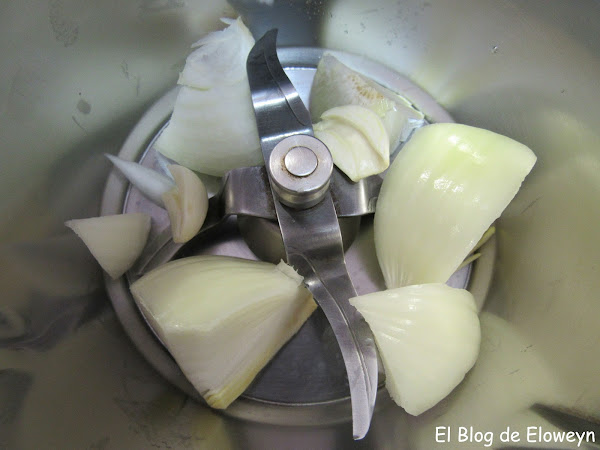 Partimos la cebolla en trozos y la ponemos en el vaso de la Thermomix.