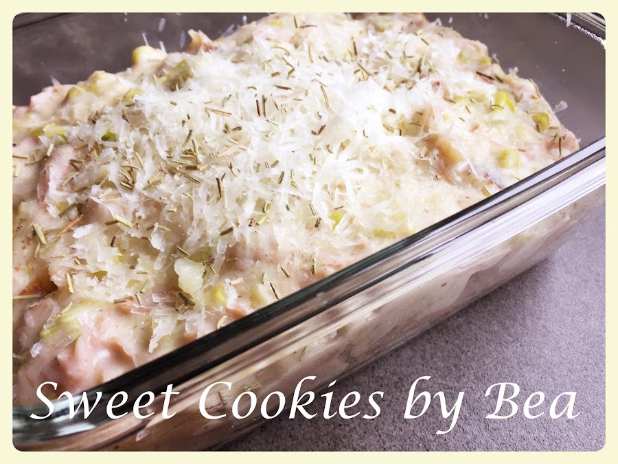 Despues le añadimos la harina y la cocinamos, removemos hasta que no veamos nada de harina. Le ponemos el queso roquefort y el semicurado dejando un poco para gratinar. Después le vamos añadiendo la leche poco a poco y veremos como la mezcla va espesando. Le ponemos sal y pimienta al gusto. Yo no le puse sal ya que los quesos llevan y no me gustan las comidas saladas. Hay veces que se me olvida poner la sal y ni me doy cuenta, suelo cocinar con especias que le dan sabor a los platos.