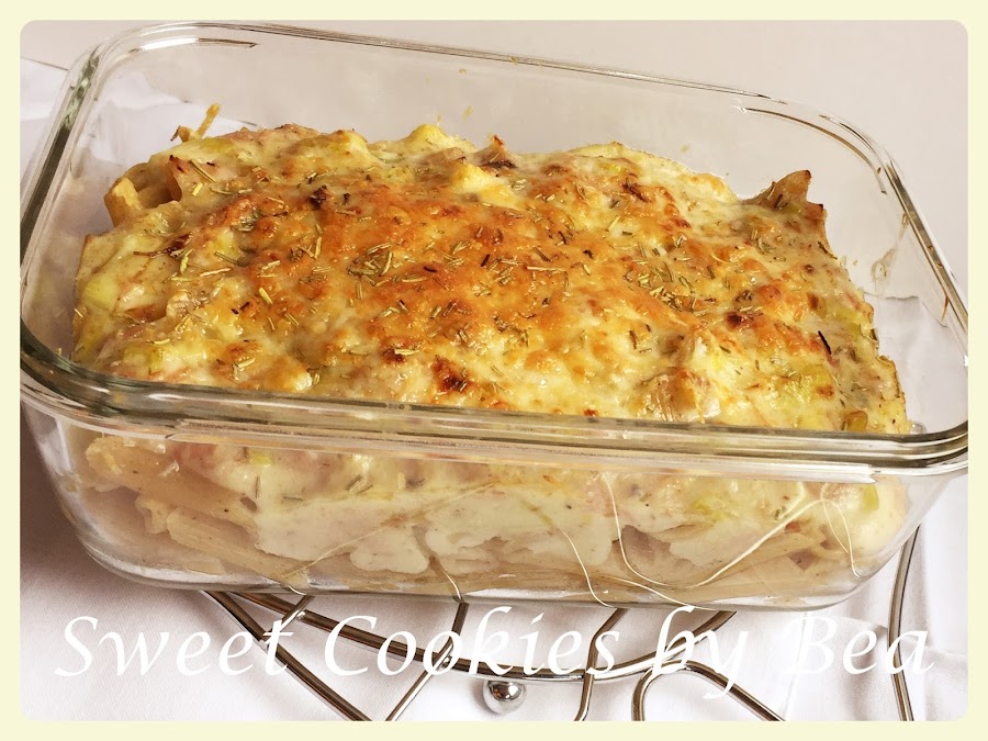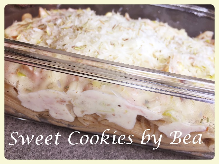 Montamos el plato en una fuente de horno, yo no me mezclado la crema con los macarrones, directamente he puesto la mitad de los macarrones en la fuente, luego la mitad de la crema, encima el resto de macarrones y por último el resto de crema junto con el queso rallado y el romero.