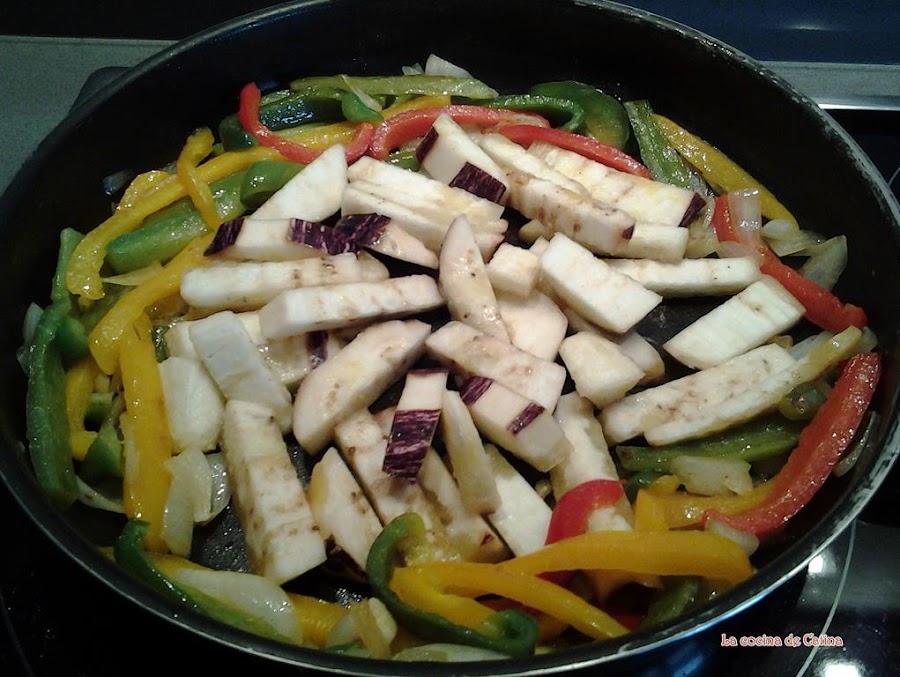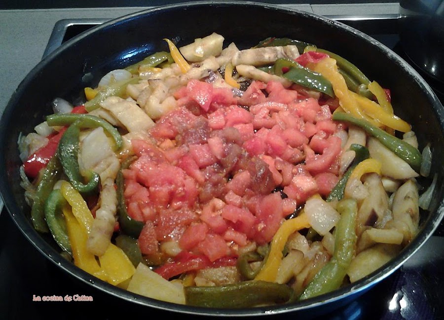 En una sartén con aceite, freímos las verduras durante 10 minutos, añadimos los tomates, sazonamos y seguimos friendo hasta que se evapore el agua del tomate.