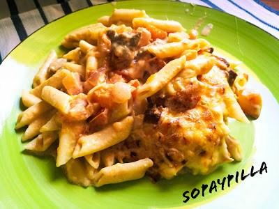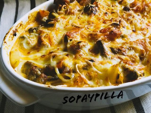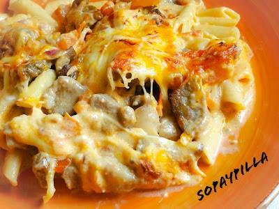 – Sobre los macarrones ponemos el sofrito, sobre el sofrito la carne, y volcamos la sala de queso, que los impregne bien.