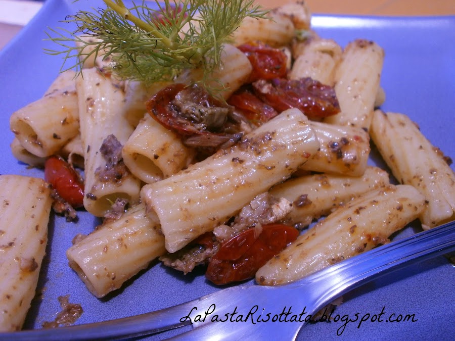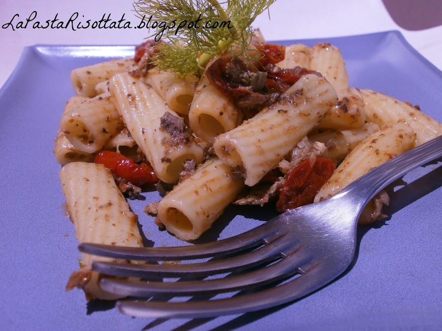Cuando la pasta esté cocida, escurrir y verter en la sartén con la salsa, remover y añadir unos cuantos tomates confitados, la "barbita" del hinojo y el perejil picados, remover y servir.
