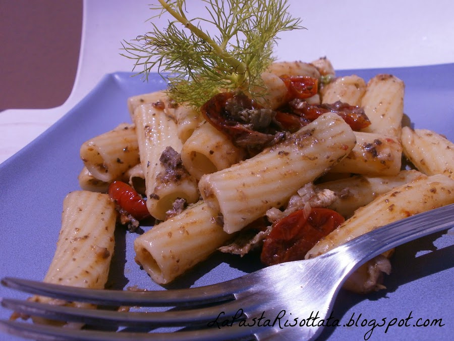 Quando la pasta sará cotta,scolatela e versatela nella padella col sugo,mescolare e aggiungere alcuni pomodorini confit,la barba di finocchio e prezzemolo tritato,mescolare e servire.