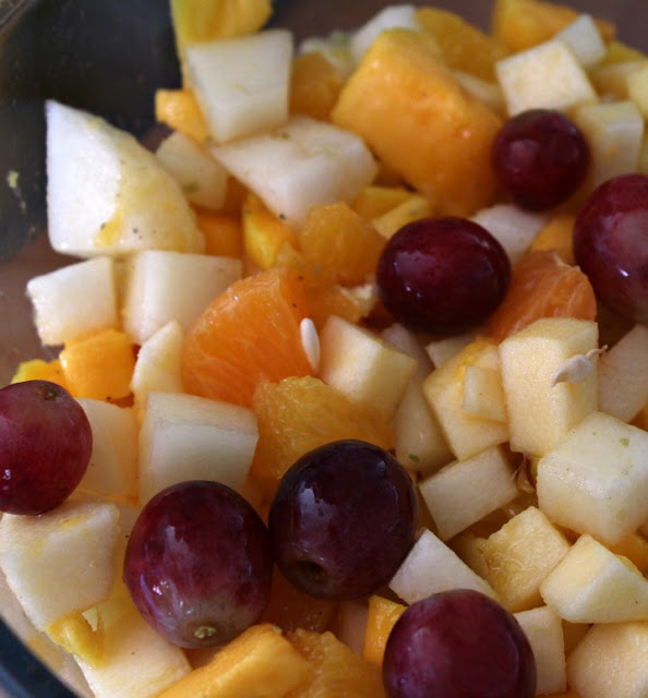 Mandarina. Pela, trata de quitarle el máximo de "hilos". Trocea y al bol con la naranja y el mango.