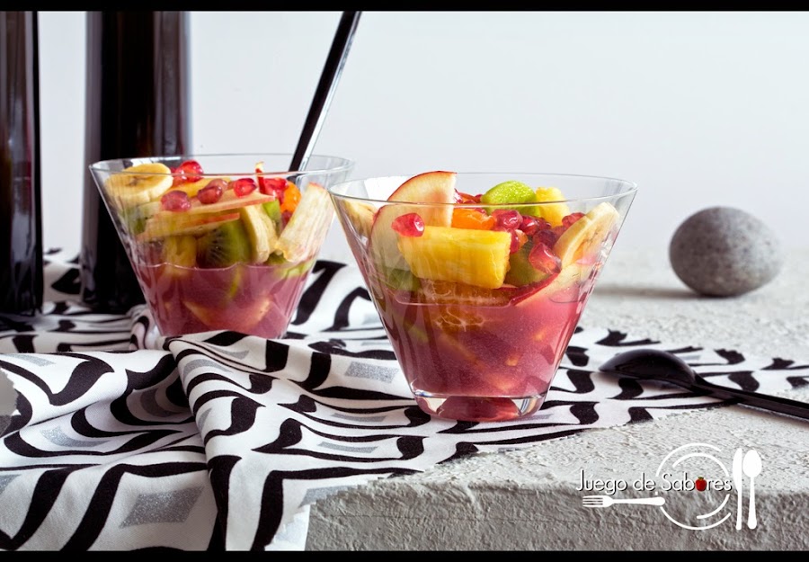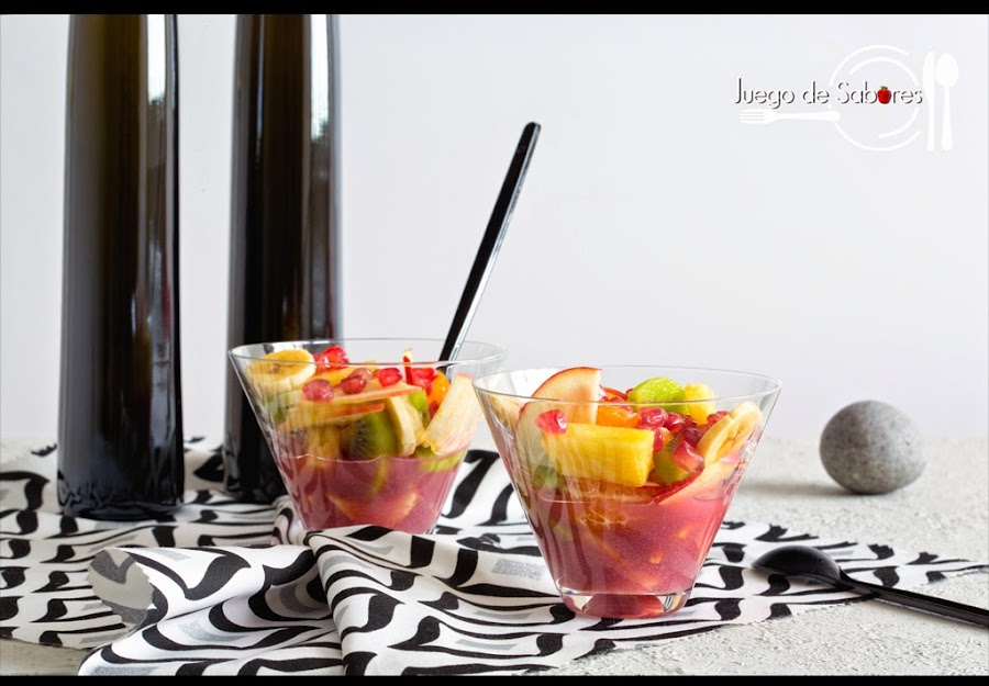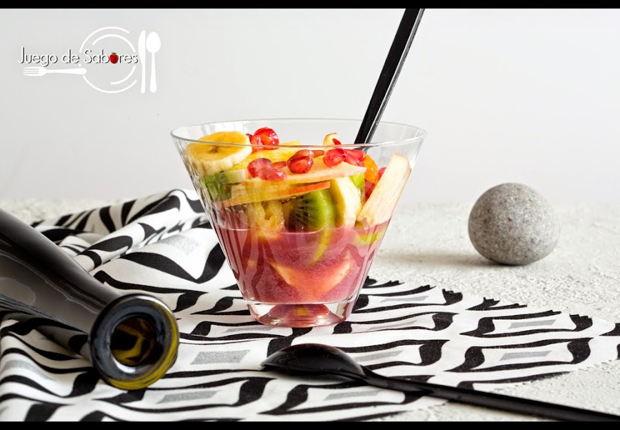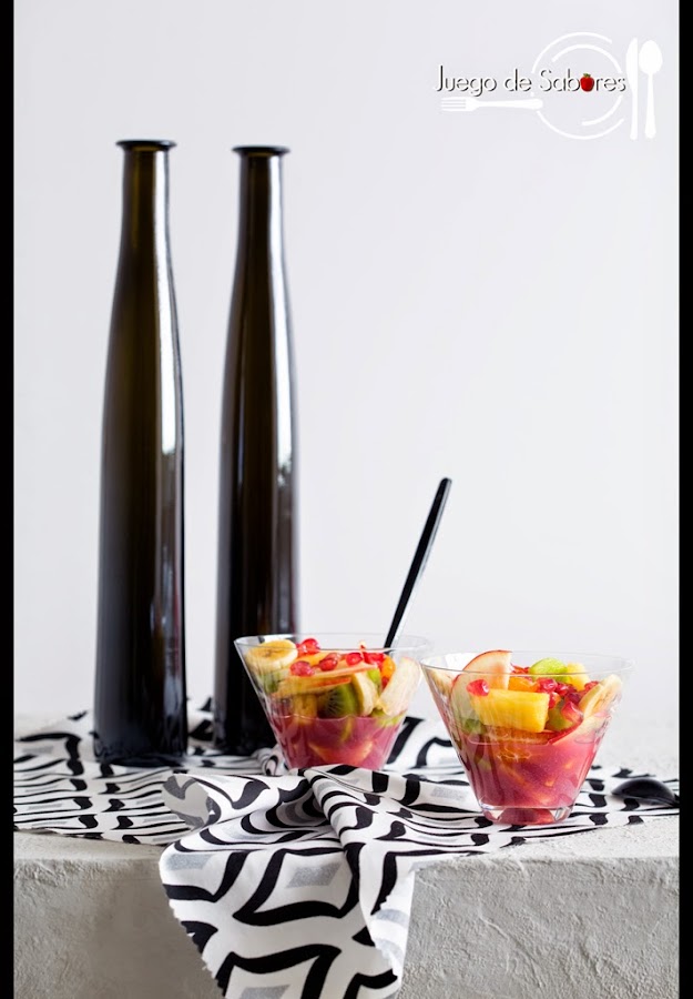 Repartir las frutas en cuatro cuencos y añadir por encima los granos de granada, por último verter por encima la salsa de granada reservada y dejar en la nevera hasta el momento de servir.