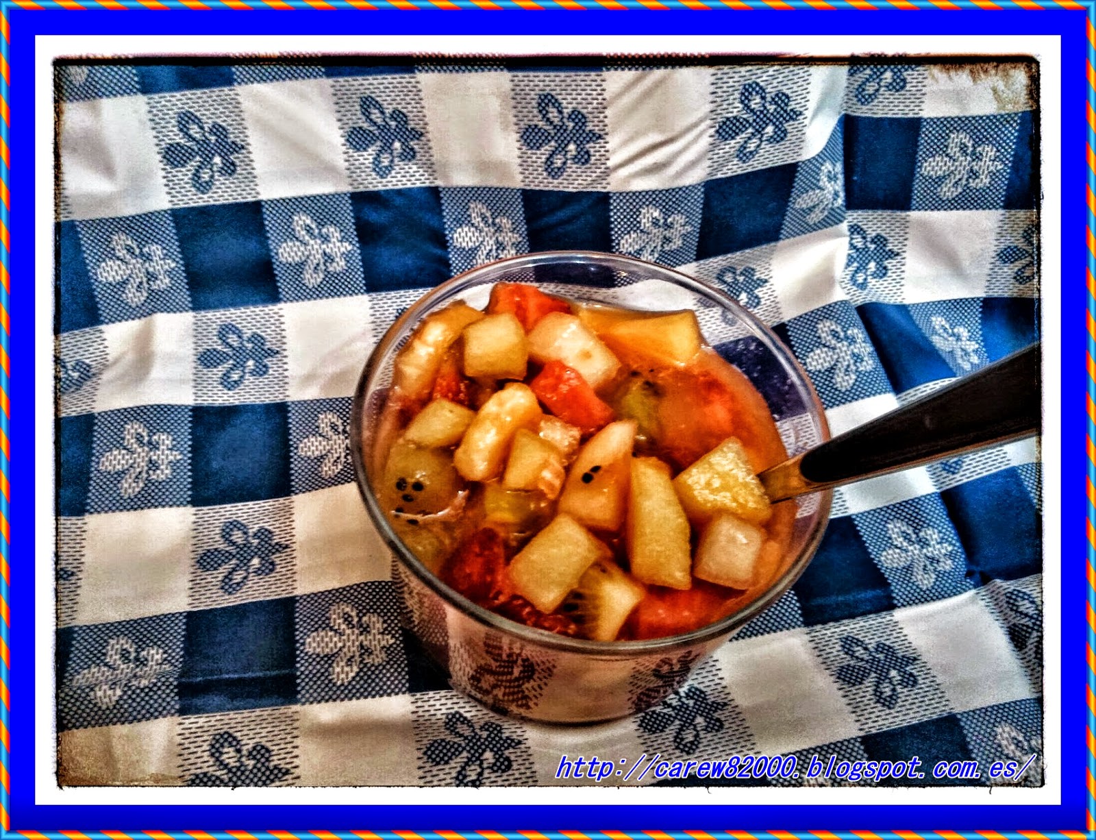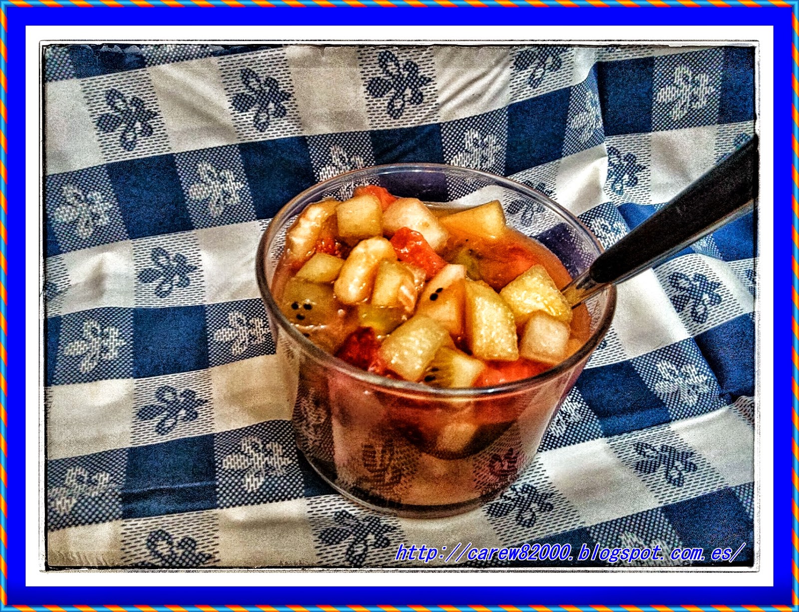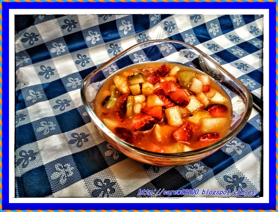 Echamos unas 4 cucharadas de azúcar y removemos de nuevo, esto ya va a gusto de cada uno, metemos en la nevera un mínimo de 10 horas pues tiene que estar fresca la macedonia para mi gusto.