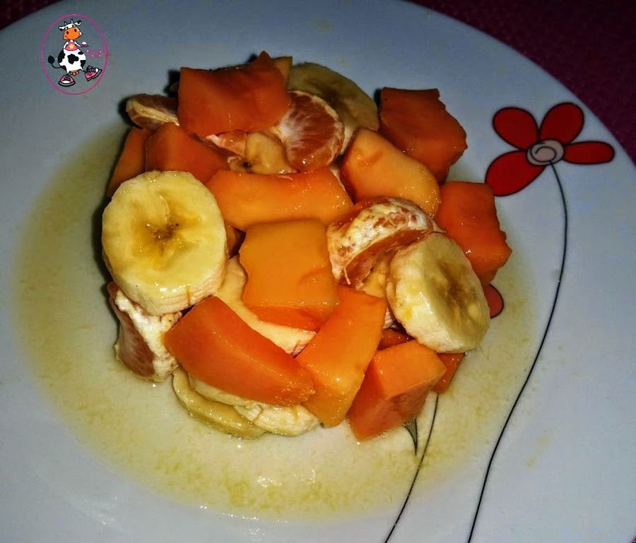 Cortamos el plátano en rodajas, pelamos la mandarina y la ponemos en gajos, pelamos la papaya y la troceamos. Mezclamos todo en un bol y cuando esté todo bien mezclado colocamos con cuidado en el plato (yo me ayude con un cortador grande de galletas). Añadimos el zumo de naranja por encima y colocamos una rodajita de naranja al lado.