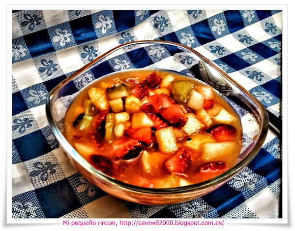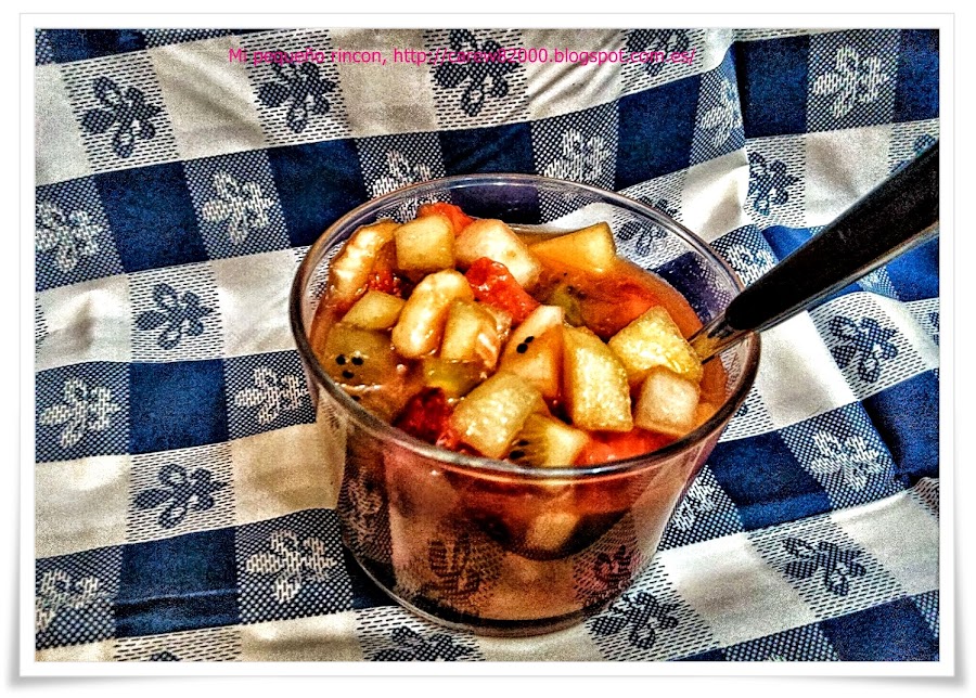 Echamos unas 4 cucharadas de azúcar y removemos de nuevo, esto ya va a gusto de cada uno, metemos en la nevera un mínimo de 10 horas pues tiene que estar fresca la macedonia para mi gusto.