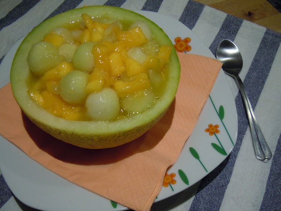 Pues hoy os voy a enseñar otra idea que podéis hacer con la propia cáscara del melón...es hacer una macedonia. Como me sobró melón y mango decidí agregarle un poquito de vino de Mistela y oye!!! vaya Macedonia me salió.
