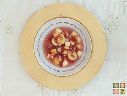 Poner todas las frutas en un cuenco, añadir la granada reservada y regar con el almíbar.María.