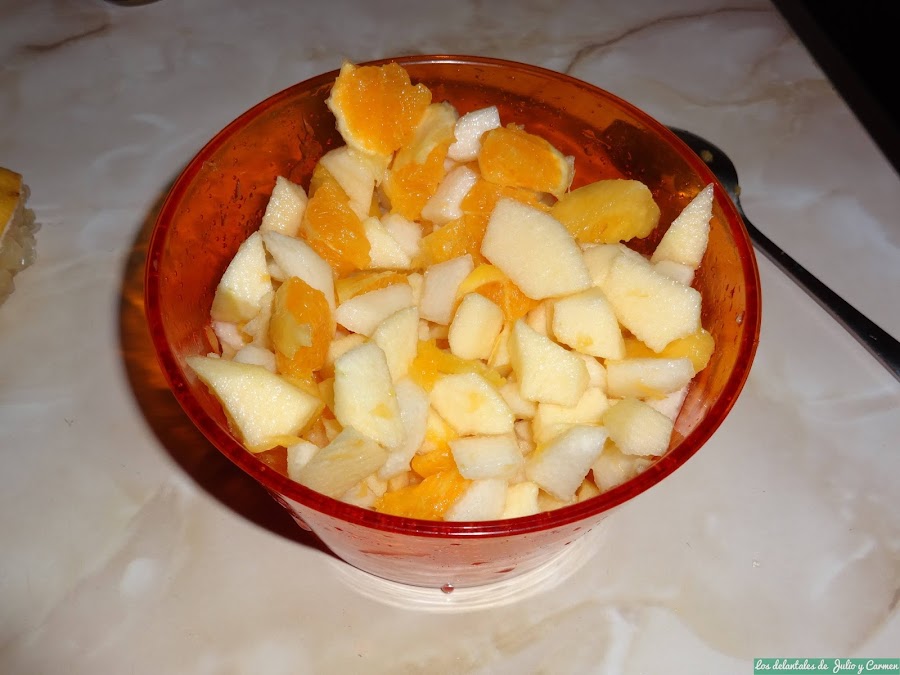 Pelamos las rodajas de piña y la naranja, y igual que las anteriores, las partiremos en trozos uniéndolas al resto de frutas.