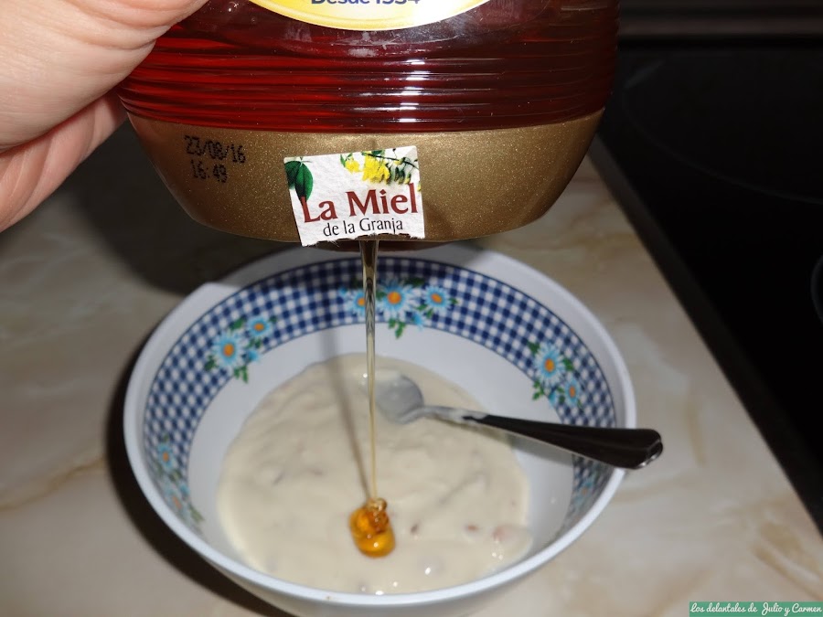 Vertemos el yogur en un recipiente apropiado y unimos a las cucharadas de miel, removiendo para unir ambos ingredientes.