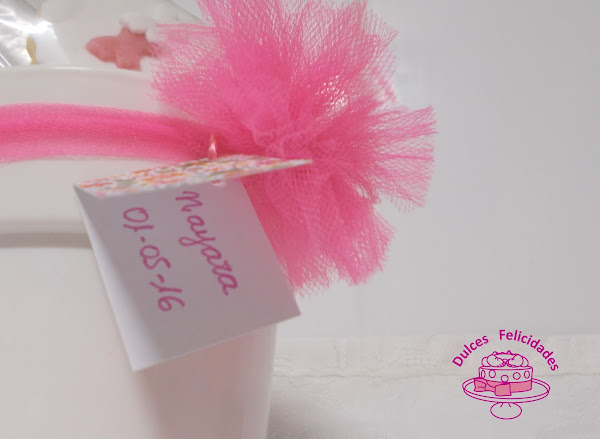 En un caso le puse un lazo y en la otra un pompón de tul. Os recomiendo tener siempre tul a mano, siempre resulta útil para decorar.