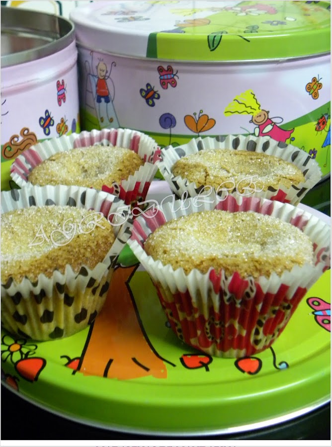 Coloque los moldes en la bandeja del horno, rellénelos hasta las ¾ partes y espolvoree con azúcar. Baje la temperatura del horno a 220º, introduzca la bandeja con las magdalenas durante 15 minutos aproximadamente.