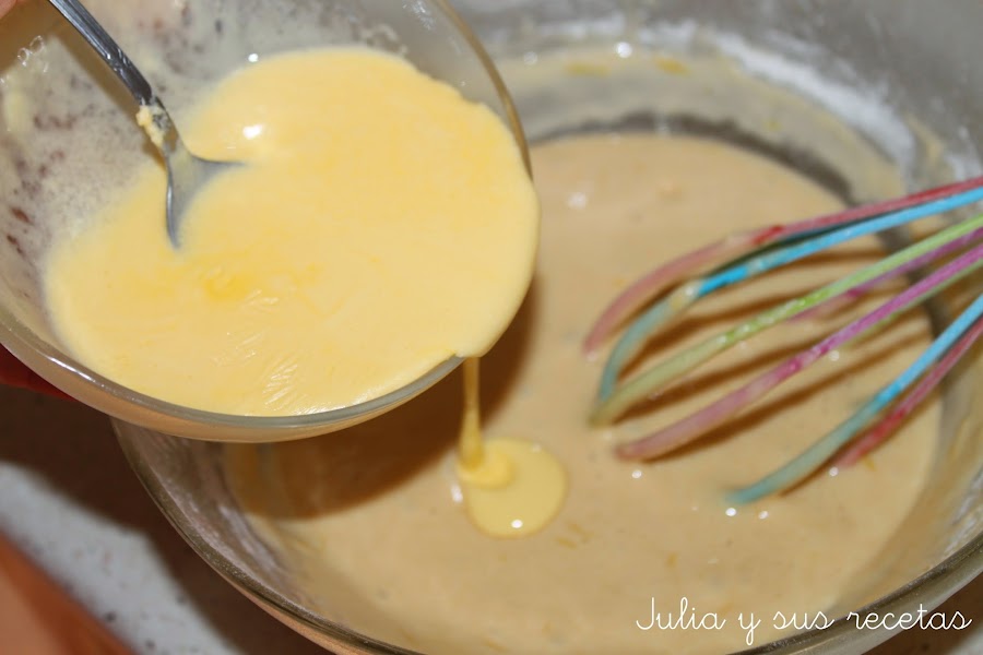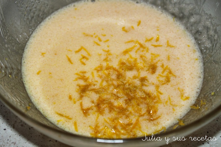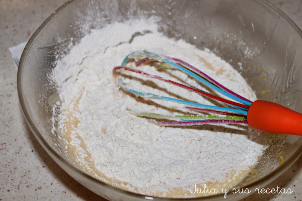 Batimos los huevos con el azúcar hasta que blanqueen. Les añadimos la ralladura de limón y la esencia de vainilla.