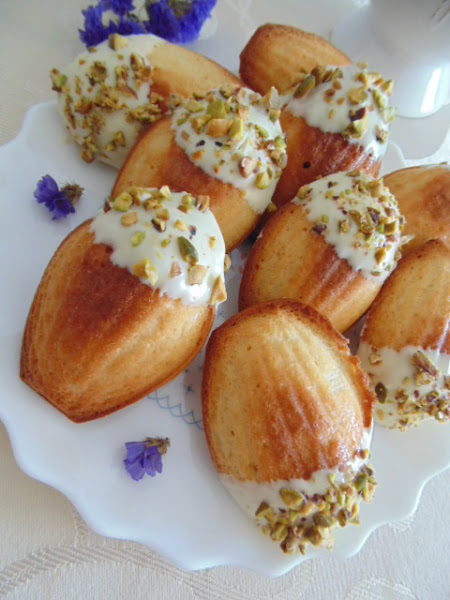 Para la cobertura sencillamente disolvemos el chocolate blanco en un cuenco en el que iremos sumergiendo nuestras delicias francesas. En otro bol añadimos los pistachos troceados y espolvoreamos con ellos la parte sumergida. Dejamos que solidifique en una rejilla. Conservamos en recipiente hermético varios días. Bon apétit!
