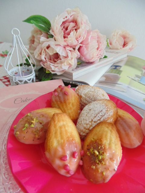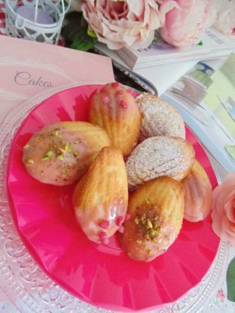 Son madeleines clásicas de sabor a vainilla, algunas espolvoreadas con azúcar glass y otras cubiertas con chocolate blanco y toque de colorante que les da un tono rosado. Las he decorado con pistachos, que me encanta como combinan con el chocolate, y con unas bolitas de sabor a frambuesa. No os las perdáis!