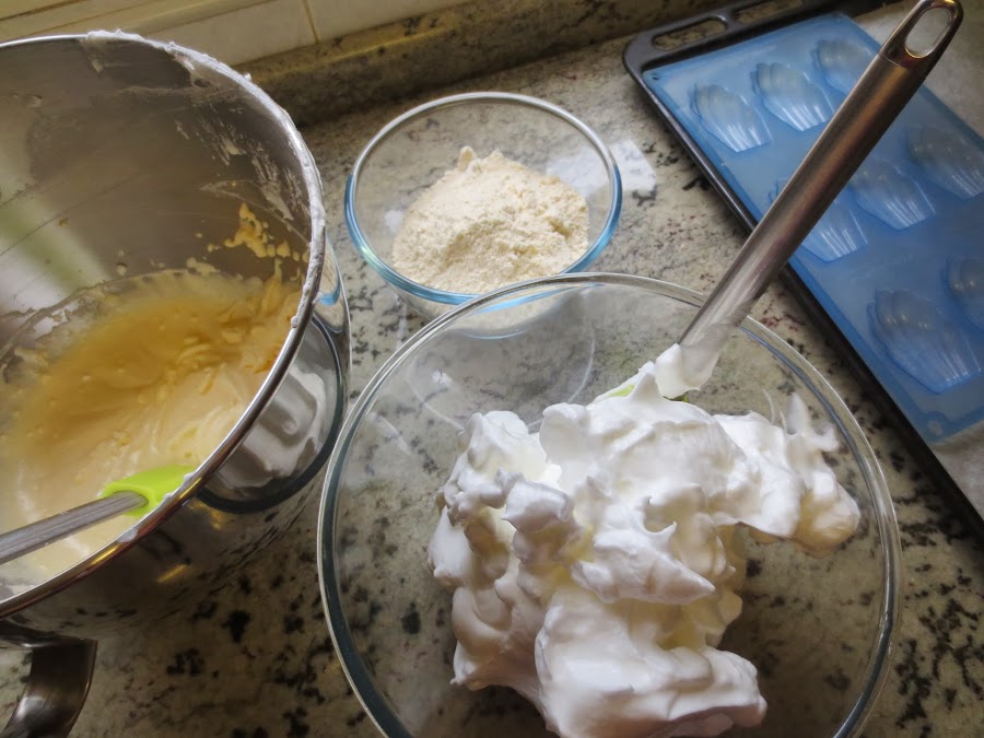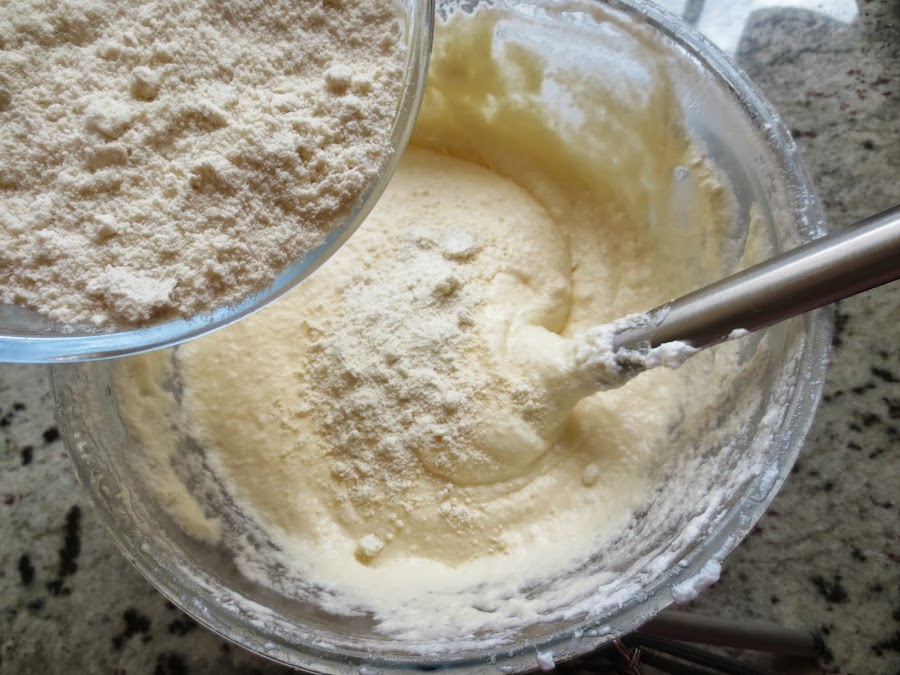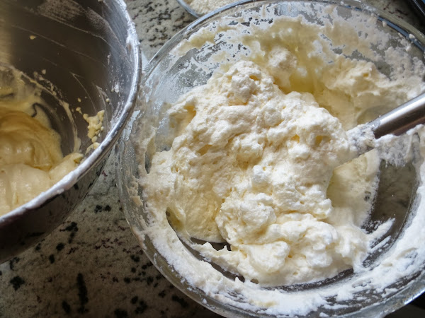 5- Con las tres mezclas preparadas, unir poco a poco las yemas a las claras en varias tandas, SIEMPRE CON MOVIMIENTOS ENVOLVENTES. Cuando esté sin grumos, hacer lo mismo con la mezcla de harina. es importante que no se baje la mezcla y quede untuosa y aireada.