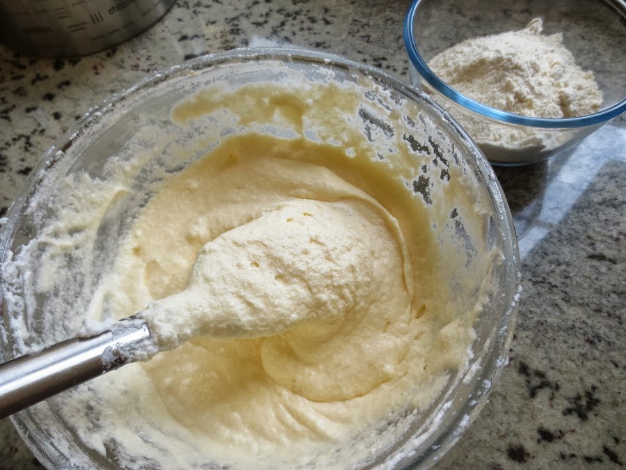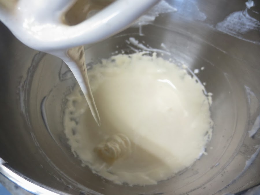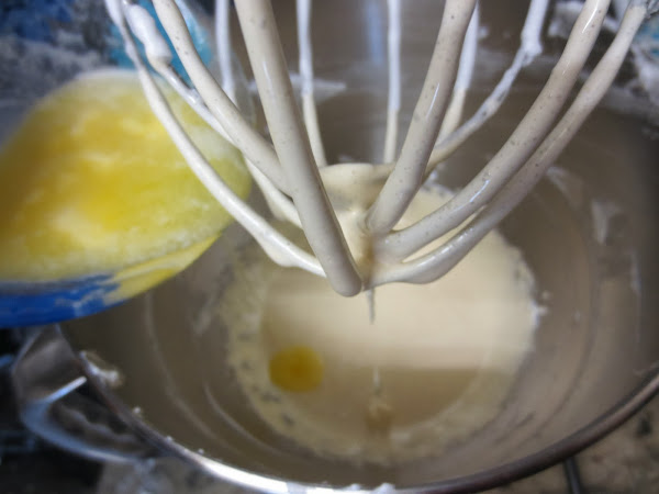 4- Añadir la mantequilla fundida (Que no esté ardiendo eh? ), y la esencia de almendras y mezclar 30 seg. vel.2.