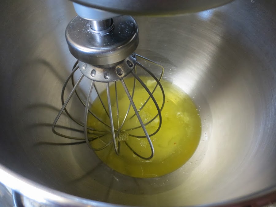 3- Sin lavar el bol ni varillas, espumar las yemas con el resto de azúcar (75 gr.) unos 2 minutos máxima velocidad hasta que blanqueen.