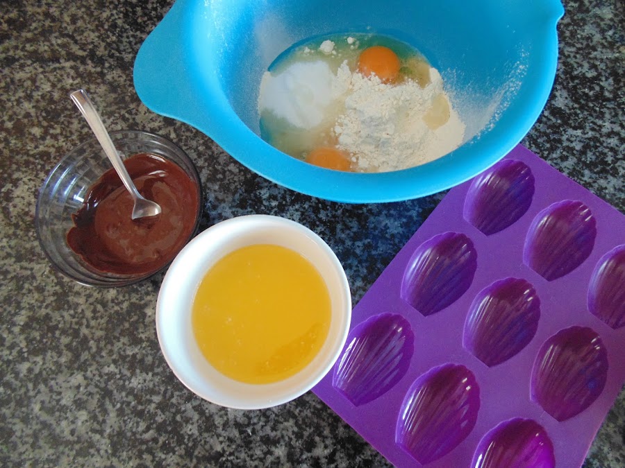 Preparación: En primer lugar disponemos los ingredientes. Comenzamos fundiendo la mantequilla en microondas. Fundimos también el chocolate. Reservamos.